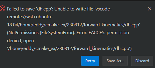 Dev record vscode WSL, ubuntu failed to save Error:EACCES: permission denied, open - 반응형 오류코드 vscode failed to save Error:EACCES: permission denied, open WSL을 VScode에 연결해서 사용하는 중에 파일 저장이 안되는 문제가 발생하였다. 해결 방법 사용자 이름과 해당 폴더를 이용해서 chown 명령어를 이용해서 권한 변경을 해주면 해결된다. sudo chown -R <사용자명> <폴더> 반응형 공유하기 게시글 관리 Barrer. better 저작자표시 비영리 변경금지 (새창열림) 'Dev record' 카테고리의 다른 글 [Python] import torch.nn as nn 역할 (0) 2023.08.14 [Python] torch.no_grad() 역할 (0) 2023.08.14 RuntimeError: PytorchStreamReader failed reading zip archive: failed finding central directory (0) 2023.08.11 Traceback (most recent call last): File "C:\Users\labadmin\Desktop\0810\mmdetection-2.x\train.py", line 88, in <module> model = build_detector(cfg.model, train_cfg=cfg.get('train_cfg'), test_cfg=cfg.get('test_cfg'))NameError: name 'build_detector' i.. (0) 2023.08.10 'pip'은(는) 내부 또는 외부 명령, 실행할 수 있는 프로그램, 또는 배치 파일이 아닙니다. (0) 2023.08.08 Contents 당신이 좋아할만한 콘텐츠 [Python] import torch.nn as nn 역할 2023.08.14 [Python] torch.no_grad() 역할 2023.08.14 RuntimeError: PytorchStreamReader failed reading zip archive: failed finding central directory 2023.08.11 Traceback (most recent call last): File "C:\Users\labadmin\Desktop\0810\mmdetection-2.x\train.py", line 88, in <module> model = build_detector(cfg.model, train_cfg=cfg.get('train_cfg'), test_cfg=cfg.get('test_cfg'))NameError: name 'build_detector' i.. 2023.08.10 댓글 0 + 이전 댓글 더보기