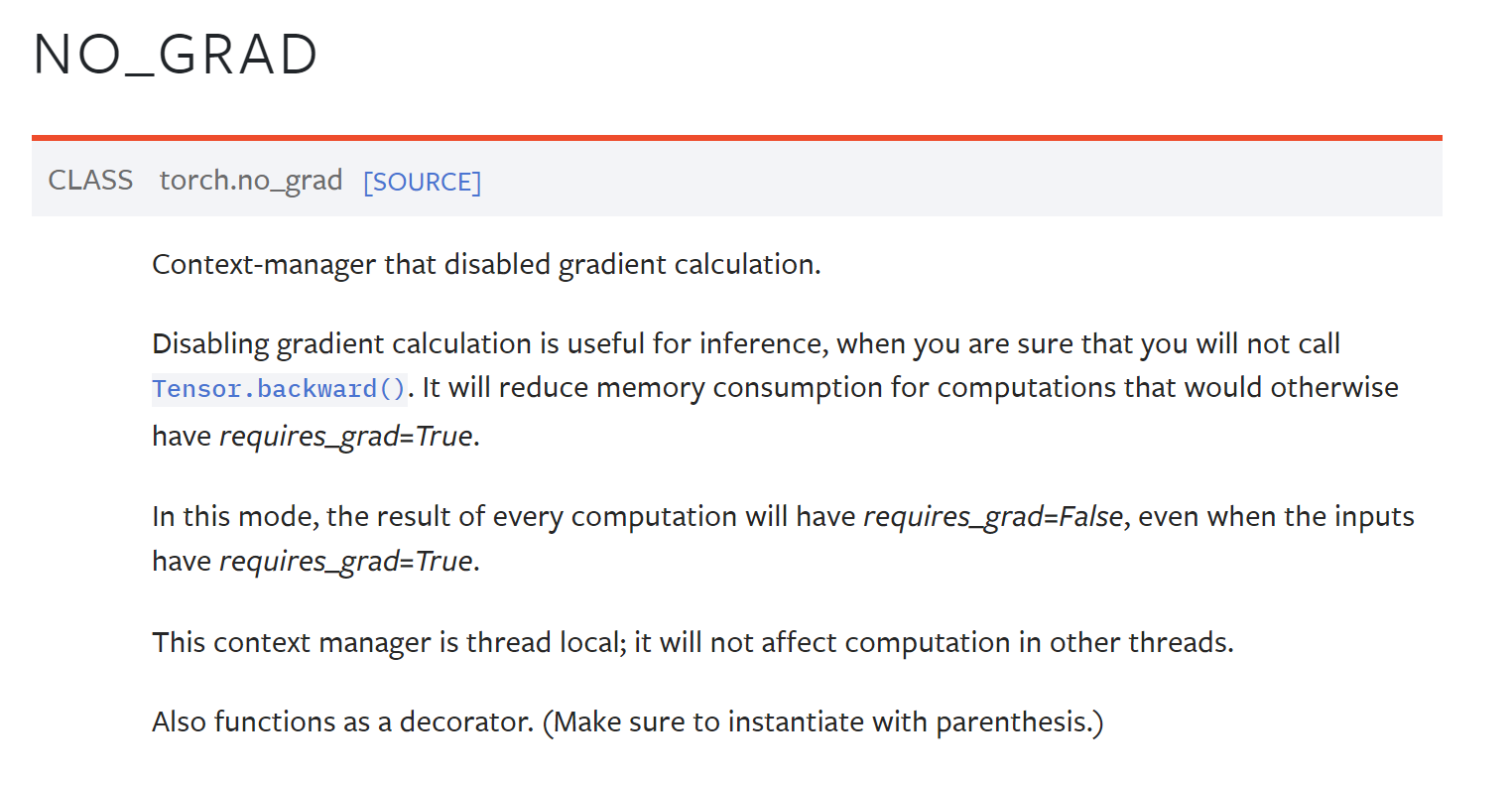 Dev record [Python] torch.no_grad() 역할 - 반응형 pytorch를 사용하다 보면 torch.no_grad()라는 걸 종종 확인할 수 있다. torch.no_grad()의 역할은 딥러닝 모델을 test, 즉 inference를 할 때에는 backpropagation이 진행되지 않는다. 즉, gradient 연산을 전혀 사용하지 않는다. 그렇기 때문에 굳이 torch에서 auto gradient 연산이 돌아가게 켜 둘 필요가 없다. 따라서 위 pytorch 공식 문서에 나와있는 것 처럼 gradient 연산을 꺼서 불필요한 메모리 사용량을 줄이는 것이 목적이다. https://pytorch.org/docs/stable/generated/torch.no_grad.html no_grad — PyTorch 2.0 documentation Shortcuts pytorch.org 반응형 공유하기 게시글 관리 Barrer. better 저작자표시 비영리 변경금지 (새창열림) 'Dev record' 카테고리의 다른 글 [ROS] Ubuntu 18.04 ros melodic에 Moveit 설치하기 (0) 2023.08.27 [Python] import torch.nn as nn 역할 (0) 2023.08.14 vscode WSL, ubuntu failed to save Error:EACCES: permission denied, open (0) 2023.08.12 RuntimeError: PytorchStreamReader failed reading zip archive: failed finding central directory (0) 2023.08.11 Traceback (most recent call last): File "C:\Users\labadmin\Desktop\0810\mmdetection-2.x\train.py", line 88, in <module> model = build_detector(cfg.model, train_cfg=cfg.get('train_cfg'), test_cfg=cfg.get('test_cfg'))NameError: name 'build_detector' i.. (0) 2023.08.10 Contents 당신이 좋아할만한 콘텐츠 [ROS] Ubuntu 18.04 ros melodic에 Moveit 설치하기 2023.08.27 [Python] import torch.nn as nn 역할 2023.08.14 vscode WSL, ubuntu failed to save Error:EACCES: permission denied, open 2023.08.12 RuntimeError: PytorchStreamReader failed reading zip archive: failed finding central directory 2023.08.11 댓글 0 + 이전 댓글 더보기