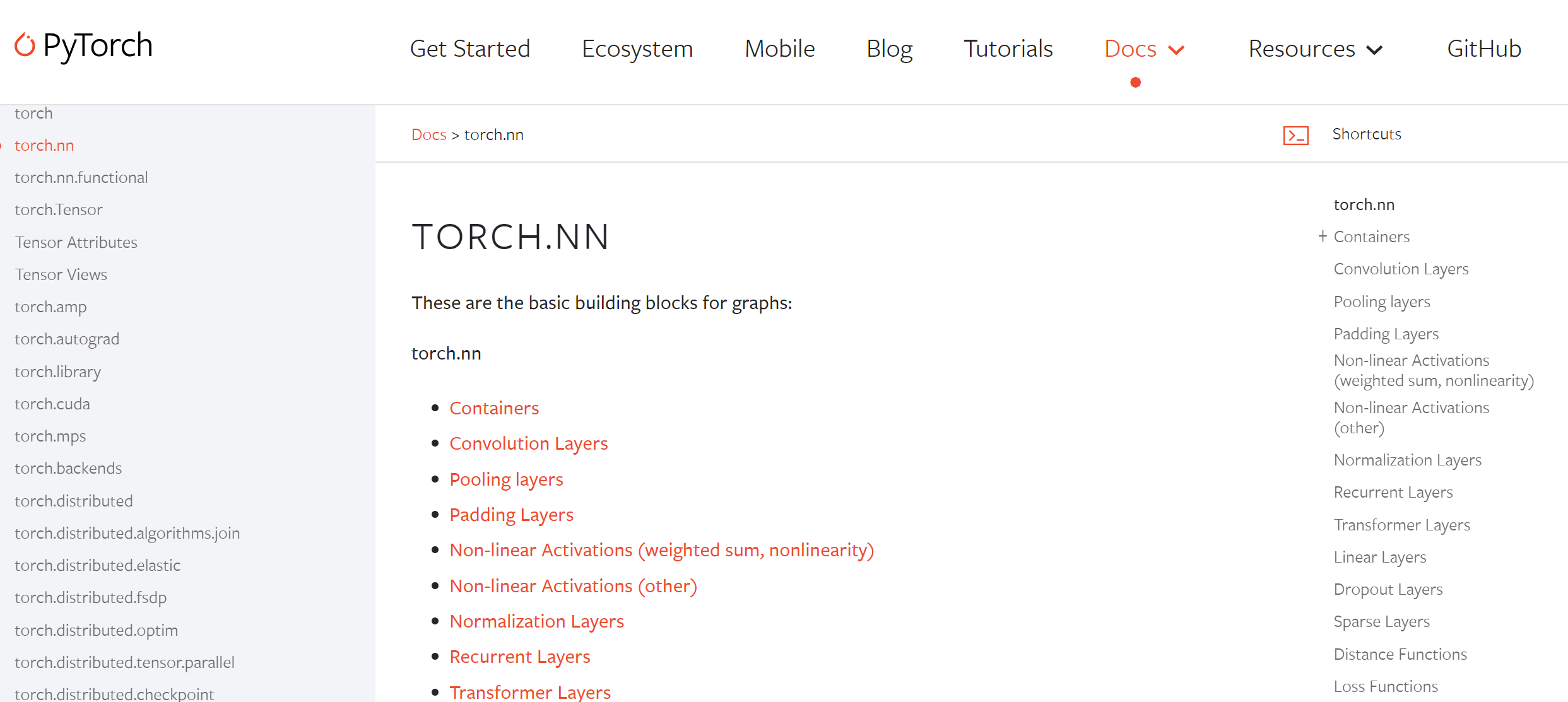 Dev record [Python] import torch.nn as nn 역할 - 반응형 import torch.nn as nn 딥러닝을 배우면서 pytorch를 쓰기 시작하면 다음과 같은 코드를 많이 봤을 것이다. torch.nn은 neural network (인공 신경망) 에 사용되는 다양한 클래스와 모듈이 포함되어있다. 예를 들어 위 코드에서도 보면 torch.nn을 import 하고 Linear, ReLU 등을 사용하는 것을 볼 수 있다. https://pytorch.org/docs/stable/nn.html torch.nn — PyTorch 2.0 documentation Shortcuts pytorch.org 파이토치 공식 문서를 보면 딥러닝에서 사용되는 다양한 layer, container 등을 확인 할 수 있다. 반응형 공유하기 게시글 관리 Barrer. better 저작자표시 비영리 변경금지 (새창열림) 'Dev record' 카테고리의 다른 글 VS Code Server for WSL closed unexpectedly. Check WSL terminal for more details. VSCode에서 WSL 접속 안될 경우 (0) 2023.08.27 [ROS] Ubuntu 18.04 ros melodic에 Moveit 설치하기 (0) 2023.08.27 [Python] torch.no_grad() 역할 (0) 2023.08.14 vscode WSL, ubuntu failed to save Error:EACCES: permission denied, open (0) 2023.08.12 RuntimeError: PytorchStreamReader failed reading zip archive: failed finding central directory (0) 2023.08.11 Contents 당신이 좋아할만한 콘텐츠 VS Code Server for WSL closed unexpectedly. Check WSL terminal for more details. VSCode에서 WSL 접속 안될 경우 2023.08.27 [ROS] Ubuntu 18.04 ros melodic에 Moveit 설치하기 2023.08.27 [Python] torch.no_grad() 역할 2023.08.14 vscode WSL, ubuntu failed to save Error:EACCES: permission denied, open 2023.08.12 댓글 0 + 이전 댓글 더보기
