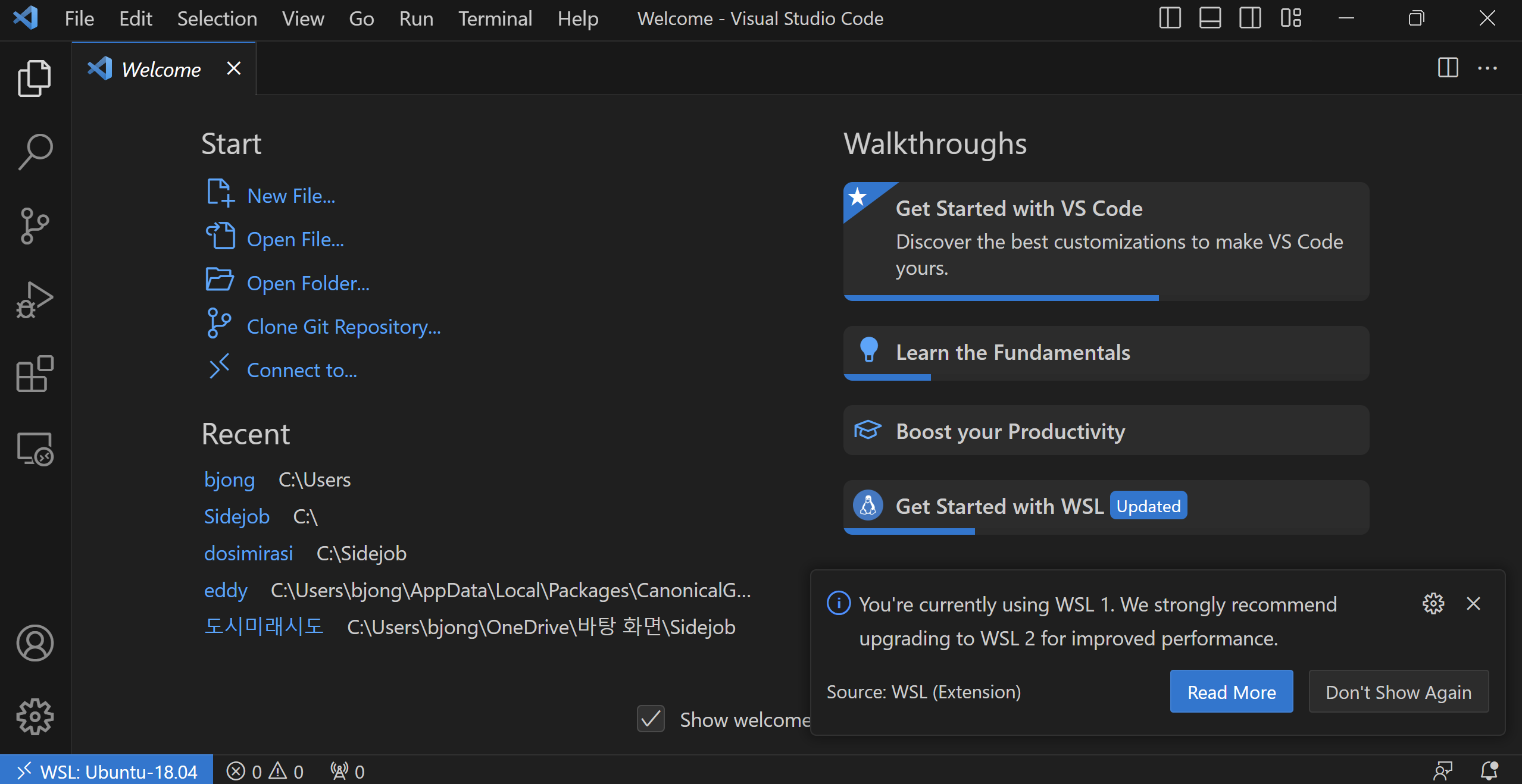 좌측 하단에 WSL: Ubuntu-18.04라고 뜨면서 정상적으로 Remote를 이용한 WSL이 작동하는 것을 확인할 수 있다.