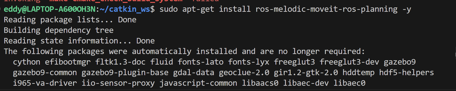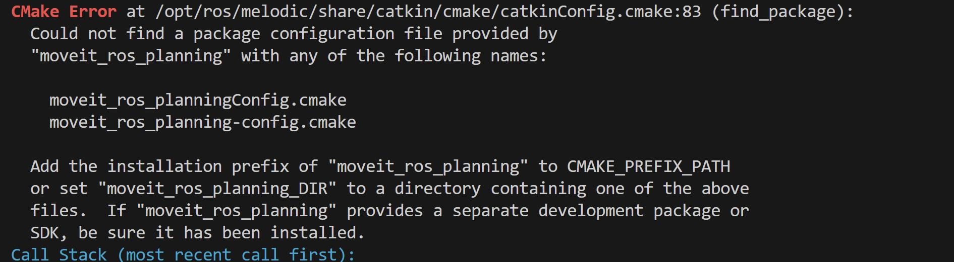 CMake Error at /opt/ros/melodic/share/catkin/cmake/catkinConfig.cmake:83 (find_package): Could not find a package configuration file provided by "moveit_ros_planning" with any of the following names: