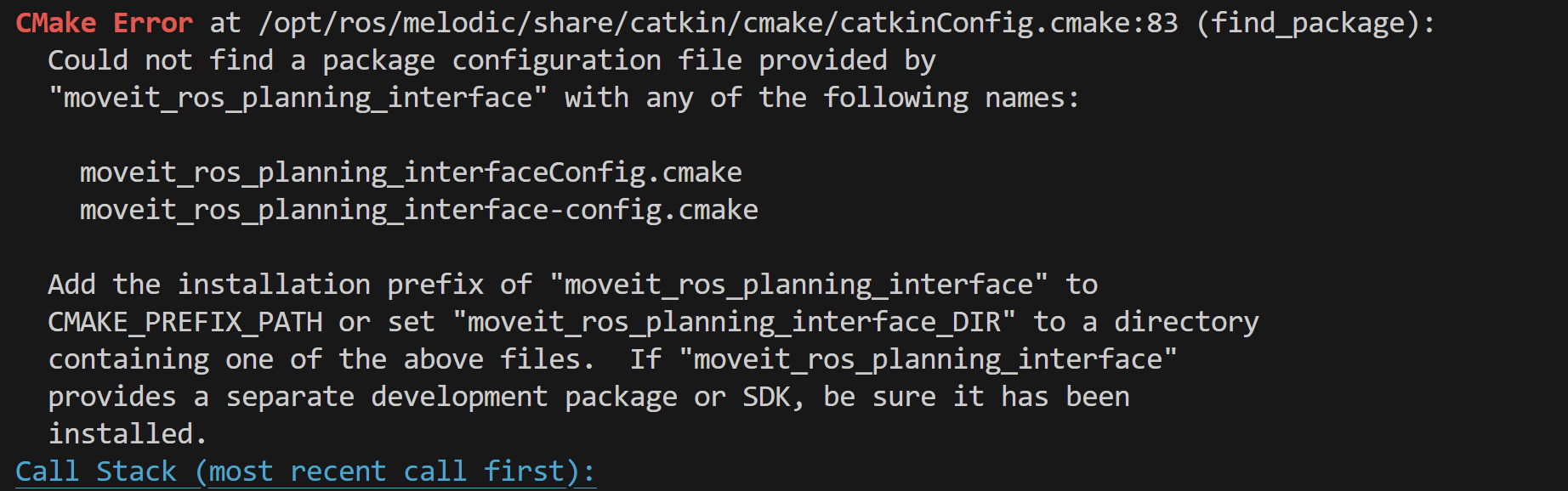 CMake Error at /opt/ros/melodic/share/catkin/cmake/catkinConfig.cmake:83 (find_package): Could not find a package configuration file provided by "moveit_ros_planning_interface" with any of the following names: