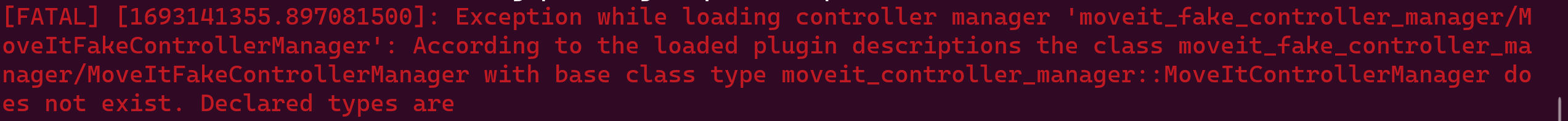 [FATAL] [1693141355.897081500]: Exception while loading controller manager 'moveit_fake_controller_manager/MoveItFakeControllerManager': According to the loaded plugin descriptions the class moveit_fake_controller_manager/MoveItFakeControllerManager with base class type moveit_controller_manager::MoveItControllerManager does not exist. Declared types are