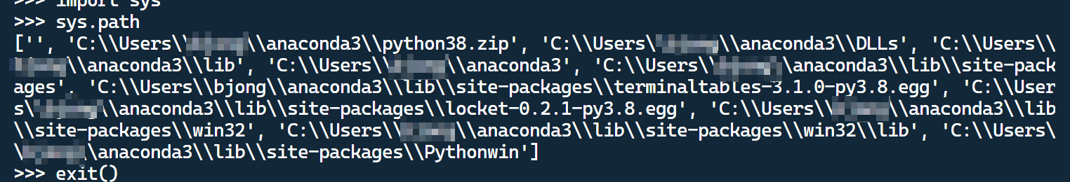 터미널에 python을 입력하여 인터프리터를 들어간 다음 sys.path를 입력한다.
