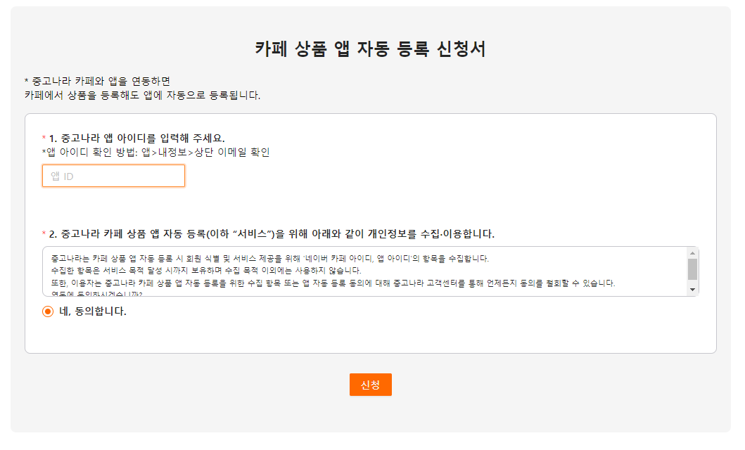 위의 링크를 들어가면 이렇게 창이 나오는데 중고나라 어플에 가입한 메일 주소를 입력하고 신청 버튼을 누르면 끝