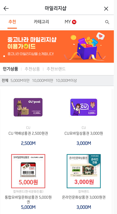 추천인 코드로 가입후 받은 포인트로 마일리지샵에 들어가면 여러 종류의 상품권이 있다.