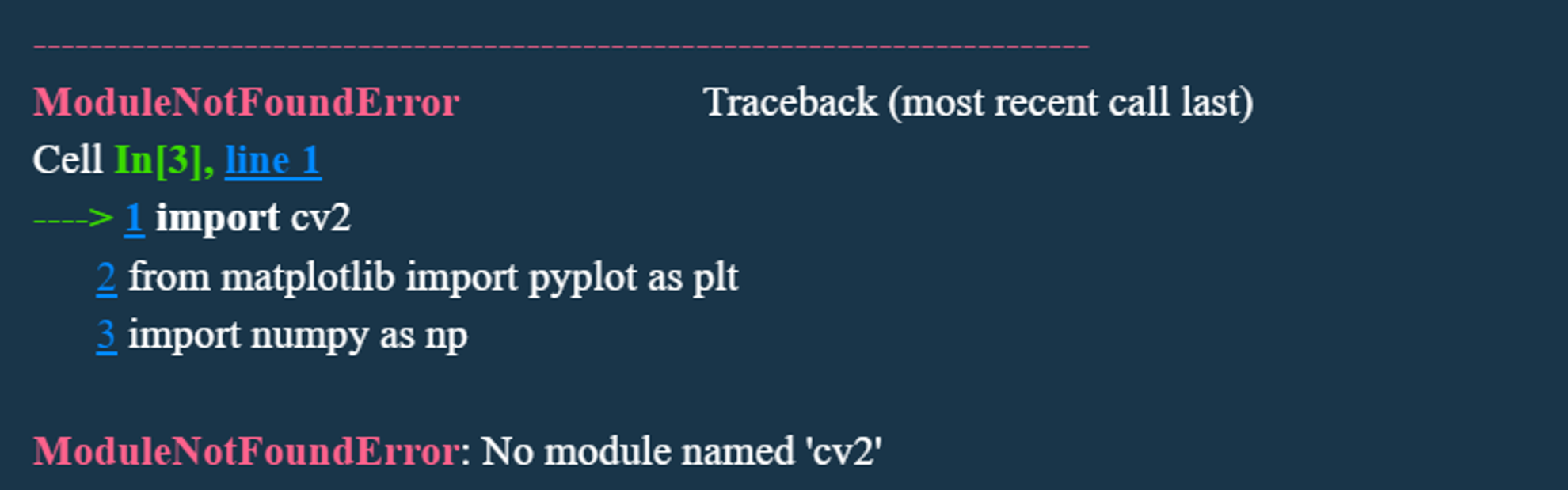 Dev record ModuleNotFoundError: No module named 'cv2' - 반응형 문제 상황 OpenCV가 설치되어 있지 않아 모듈을 import 할때 오류 발생 ModuleNotFoundError: No module named 'cv2' 해결 방안 아래의 명령어로 OpenCV를 설치한다. pip install opencv-python 반응형 공유하기 게시글 관리 Barrer. better 저작자표시 비영리 변경금지 (새창열림) 'Dev record' 카테고리의 다른 글 ModuleNotFoundError: No module named 'IPython’ (0) 2024.07.02 SyntaxError: Non-ASCII character '\xce' in file /home/eddie/depth_estimation/monocular-depth-estimation/trainer.py on line 360, but no encoding declared; see http://python.org/dev/peps/pep-0263/ for details (0) 2024.07.02 ModuleNotFoundError: No module named 'skimage' (0) 2024.02.04 ModuleNotFoundError: No module named 'skimage' (0) 2024.02.04 DecompressionBombWarning: Image size (139213872 pixels) exceeds limit of 89478485 pixels, could be decompression bomb DOS attack. (0) 2024.02.04 Contents 당신이 좋아할만한 콘텐츠 ModuleNotFoundError: No module named 'IPython’ 2024.07.02 SyntaxError: Non-ASCII character '\xce' in file /home/eddie/depth_estimation/monocular-depth-estimation/trainer.py on line 360, but no encoding declared; see http://python.org/dev/peps/pep-0263/ for details 2024.07.02 ModuleNotFoundError: No module named 'skimage' 2024.02.04 ModuleNotFoundError: No module named 'skimage' 2024.02.04 댓글 0 + 이전 댓글 더보기