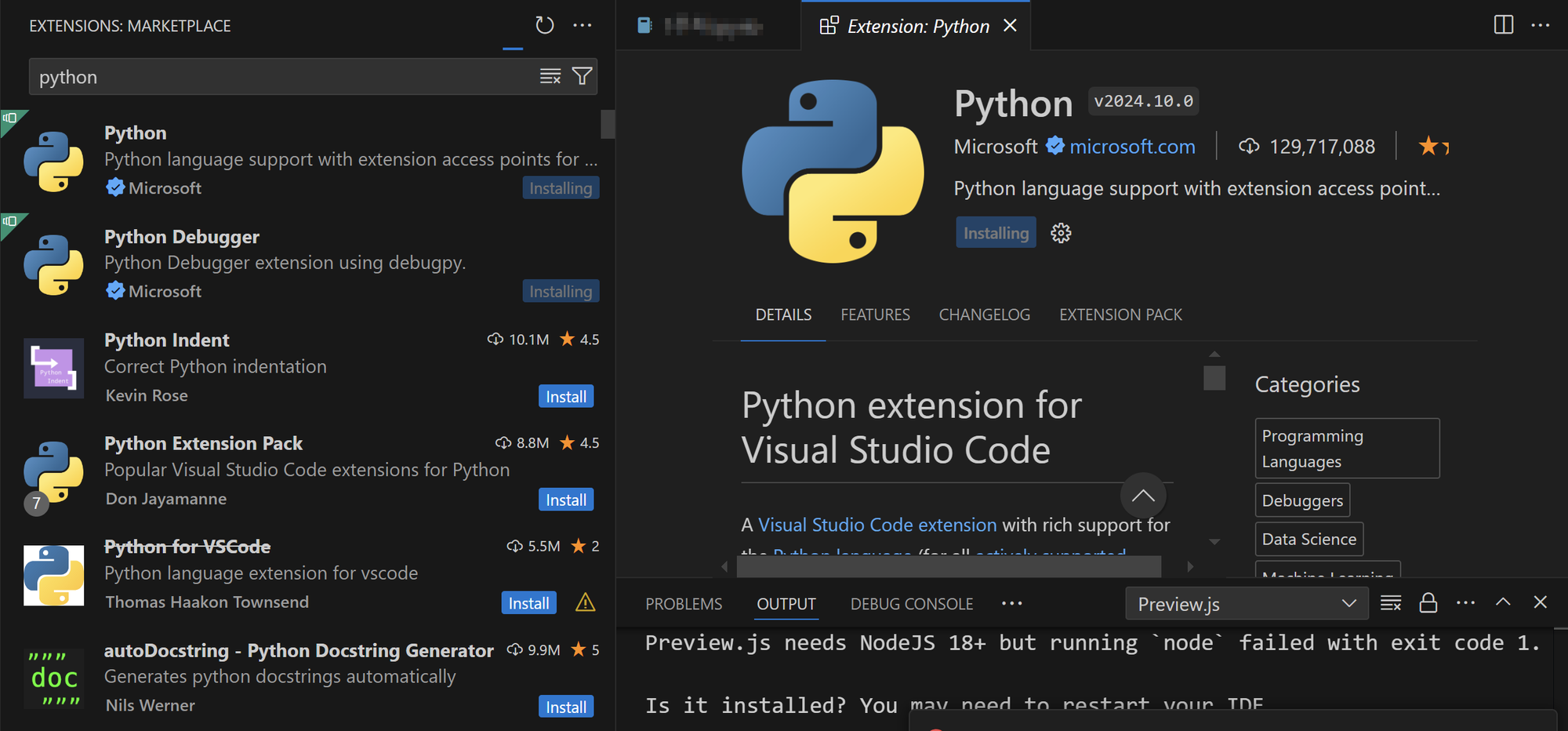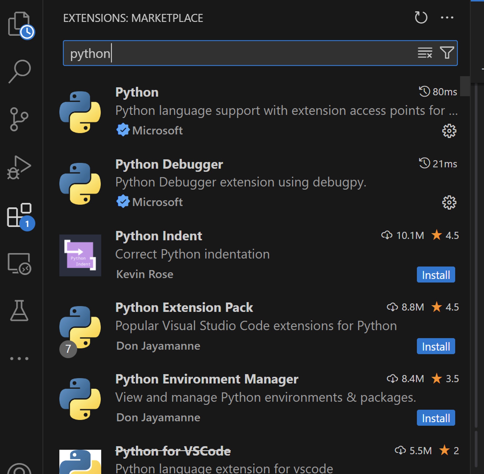 extension 탭에 들어가서 python을 검색하면 python extension을 확인할 수 있다.