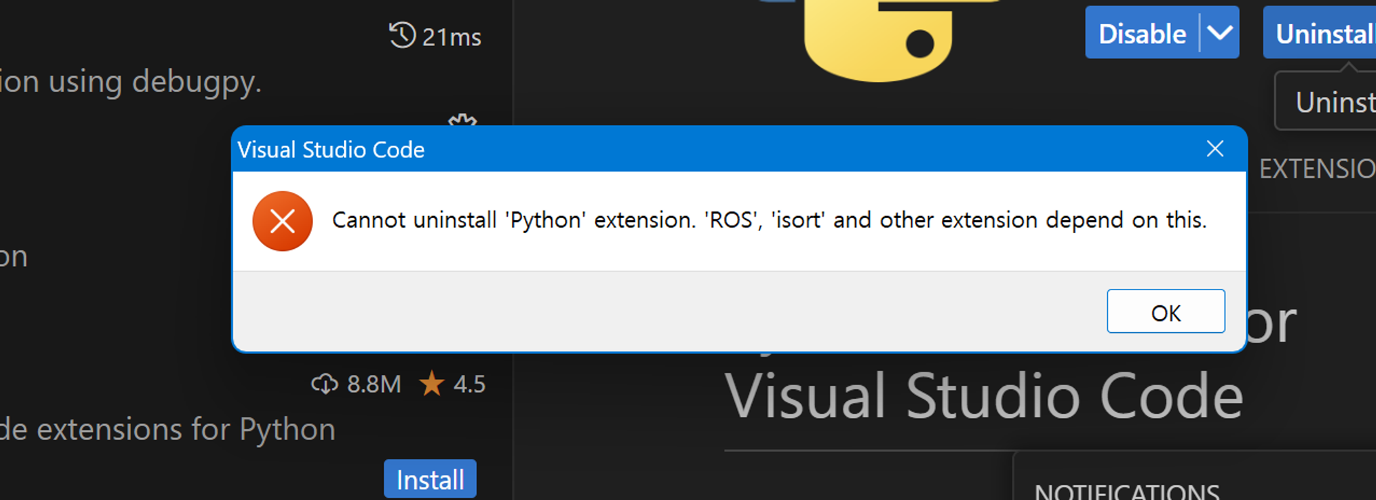 이를 해결하기 위해 ROS와 isort extension을 먼저 검색하여 삭제한 후에 python extension을 제거하였다.