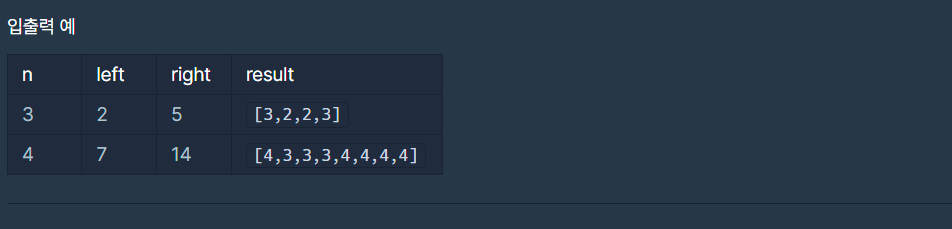 정수 n, left, right가 주어집니다. 다음 과정을 거쳐서 1차원 배열을 만들고자 합니다.