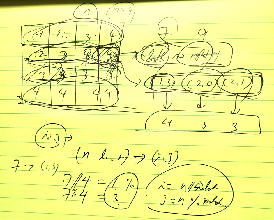 그리고 이 index 값을 n으로 나누게 되면 몫은 행의 값이, 나머지는 열 값을 얻을 수 있다.