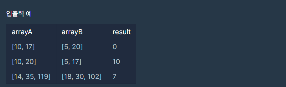 문제 설명 철수와 영희는 선생님으로부터 숫자가 하나씩 적힌 카드들을 절반씩 나눠서 가진 후, 다음 두 조건 중 하나를 만족하는 가장 큰 양의 정수 a의 값을 구하려고 합니다.철수가 가진 카드들에 적힌 모든 숫자를 나눌 수 있고 영희가 가진 카드들에 적힌 모든 숫자들 중 하나도 나눌 수 없는 양의 정수 a영희가 가진 카드들에 적힌 모든 숫자를 나눌 수 있고, 철수가 가진 카드들에 적힌 모든 숫자들 중 하나도 나눌 수 없는 양의 정수 a예를 들어, 카드들에 10, 5, 20, 17이 적혀 있는 경우에 대해 생각해 봅시다. 만약, 철수가 [10, 17]이 적힌 카드를 갖고, 영희가 [5, 20]이 적힌 카드를 갖는다면 두 조건 중 하나를 만족하는 양의 정수 a는 존재하지 않습니다. 하지만, 철수가 [10, 20]이 적힌 카드를 갖고, 영희가 [5, 17]이 적힌 카드를 갖는다면, 철수가 가진 카드들의 숫자는 모두 10으로 나눌 수 있고, 영희가 가진 카드들의 숫자는 모두 10으로 나눌 수 없습니다. 따라서 철수와 영희는 각각 [10, 20]이 적힌 카드, [5, 17]이 적힌 카드로 나눠 가졌다면 조건에 해당하는 양의 정수 a는 10이 됩니다.철수가 가진 카드에 적힌 숫자들을 나타내는 정수 배열 arrayA와 영희가 가진 카드에 적힌 숫자들을 나타내는 정수 배열 arrayB가 주어졌을 때, 주어진 조건을 만족하는 가장 큰 양의 정수 a를 return하도록 solution 함수를 완성해 주세요. 만약, 조건을 만족하는 a가 없다면, 0을 return 해 주세요.