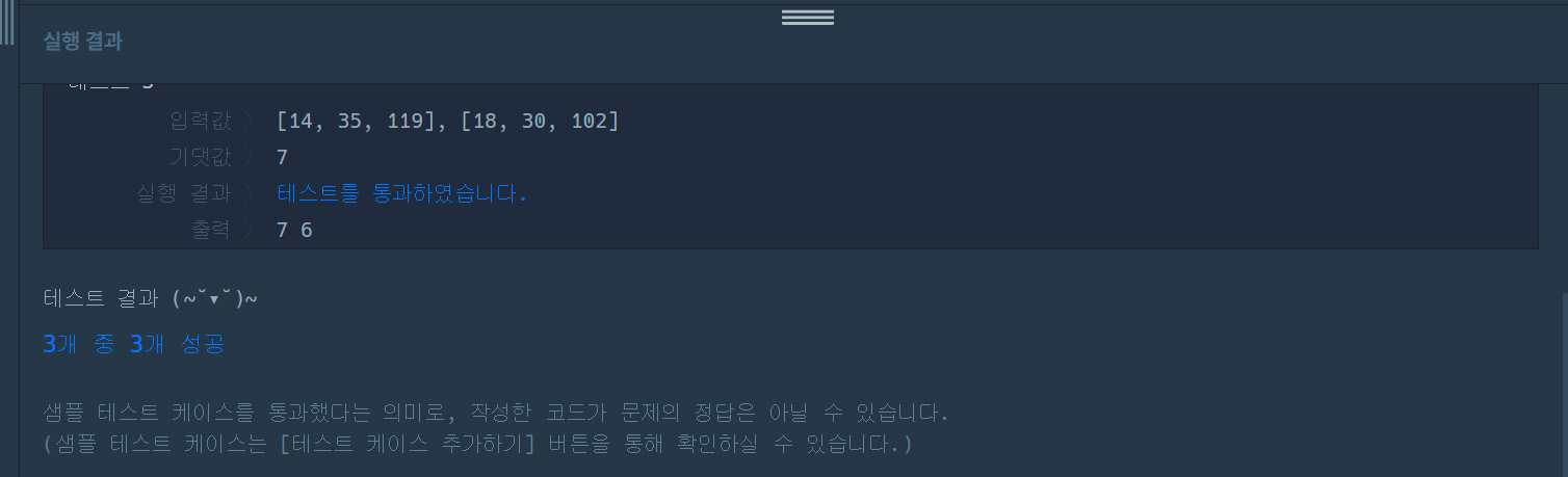 입출력 예 설명 입출력 예 #1 문제 예시와 같습니다. 입출력 예 #2 문제 예시와 같습니다. 입출력 예 #3 철수가 가진 카드에 적힌 숫자들은 모두 3으로 나눌 수 없고, 영희가 가진 카드에 적힌 숫자는 모두 3으로 나눌 수 있습니다. 따라서 3은 조건에 해당하는 양의 정수입니다. 하지만, 철수가 가진 카드들에 적힌 숫자들은 모두 7로 나눌 수 있고, 영희가 가진 카드들에 적힌 숫자는 모두 7로 나눌 수 없습니다. 따라서 최대값인 7을 return 합니다.