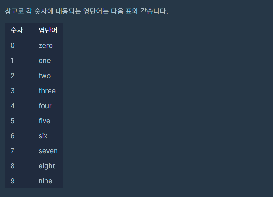 입출력 예 설명 입출력 예 #1 문제 예시와 같습니다. 입출력 예 #2 문제 예시와 같습니다. 입출력 예 #3 "three"는 3, "six"는 6, "seven"은 7에 대응되기 때문에 정답은 입출력 예 #2와 같은 234567이 됩니다.입출력 예 #2와 #3과 같이 같은 정답을 가리키는 문자열이 여러 가지가 나올 수 있습니다. 입출력 예 #4 s에는 영단어로 바뀐 부분이 없습니다.