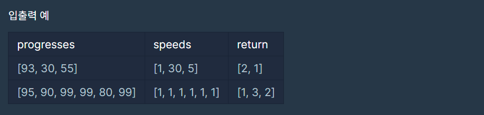 - 작업의 개수(progresses, speeds배열의 길이)는 100개 이하입니다.