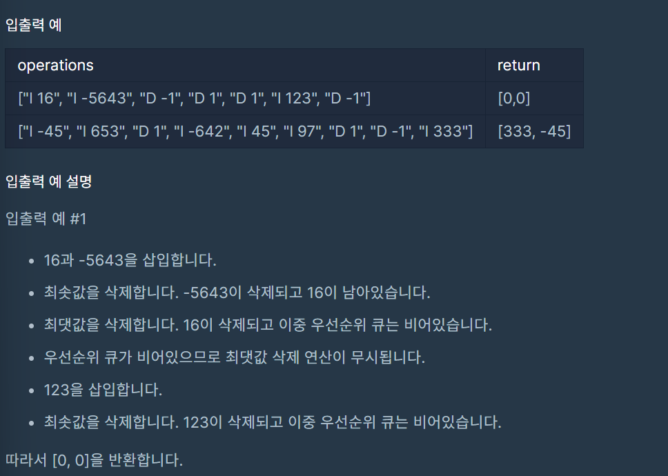 operations는 길이가 1 이상 1,000,000 이하인 문자열 배열입니다. operations의 원소는 큐가 수행할 연산을 나타냅니다. - 원소는 “명령어 데이터” 형식으로 주어집니다. - 최댓값/최솟값을 삭제하는 연산에서 최댓값/최솟값이 둘 이상인 경우, 하나만 삭제합니다. 빈 큐에 데이터를 삭제하라는 연산이 주어질 경우, 해당 연산은 무시합니다.