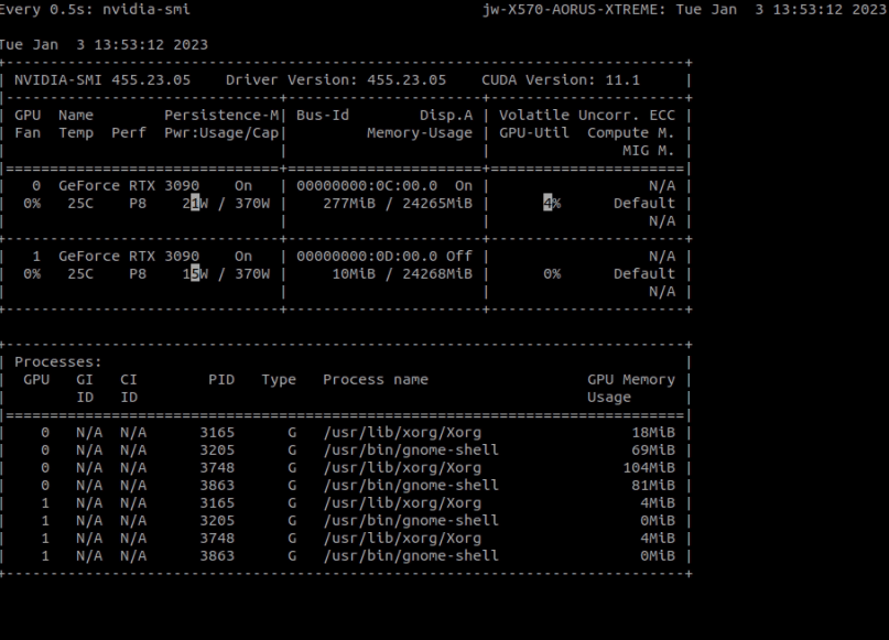 Dev record/Ubuntu 우분투 ubuntu GPU 사용량 실시간 확인하기 - 반응형 문제상황 딥러닝을 하다보면 GPU 사용량을 실시간으로 확인해야 할 때가 많다. 이때 일반적으로 사용하는 명령어인 nvidia-smi 만 사용하면 딱 그 한 번만 결과물이 아래와 같이 나온다. 때문에 확인을 하기 위해 매번 이 커맨드를 쓸 수는 없다. 더 간단하게 확인하는 방법이 있다. 해결방안 watch -d -n 0.5 nvidia-smi 이렇게 0.5초 간격으로 새로고침을 해주는 것 처럼 nvidia-smi 결과를 볼 수 있다. 반응형 공유하기 게시글 관리 Barrer. better 저작자표시 비영리 변경금지 (새창열림) 'Dev record > Ubuntu' 카테고리의 다른 글 There is no Pip installer available in the selected environment E: Unable to locate package python-pip. (0) 2023.01.04 우분투 tar.xz 압축 해제 unzip tar.xz (0) 2023.01.04 ModuleNotFoundError: No module named 'lib’ (0) 2023.01.02 (gedit:2102): Gtk-WARNING **: 08:49:30.176: cannot open display: :0 (0) 2023.01.02 E: Failed to fetch http://mirror.kakao.com/ubuntu/pool/main/c/cups/libcups2_2.2.7-1ubuntu2.8_amd64.deb 404 Not Found (0) 2023.01.02 Contents 당신이 좋아할만한 콘텐츠 There is no Pip installer available in the selected environment E: Unable to locate package python-pip. 2023.01.04 우분투 tar.xz 압축 해제 unzip tar.xz 2023.01.04 ModuleNotFoundError: No module named 'lib’ 2023.01.02 (gedit:2102): Gtk-WARNING **: 08:49:30.176: cannot open display: :0 2023.01.02 댓글 0 + 이전 댓글 더보기