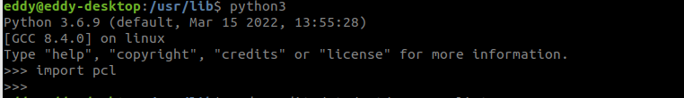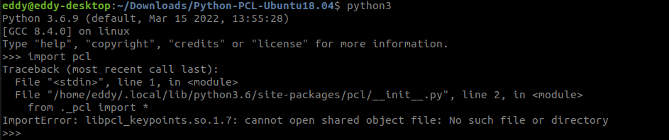 Python 3.6.9 (default, Mar 15 2022, 13:55:28) [GCC 8.4.0] on linux Type "help", "copyright", "credits" or "license" for more information. >>> import pcl Traceback (most recent call last): File "<stdin>", line 1, in <module> File "/home/eddy/.local/lib/python3.6/site-packages/pcl/__init__.py", line 2, in <module> from ._pcl import * ImportError: libpcl_keypoints.so.1.7: cannot open shared object file: No such file or directory