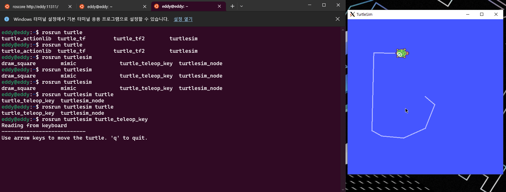그 다음 이 시뮬레이션의 거북이를 키보드로 작동시키는 노드를 실행한다.