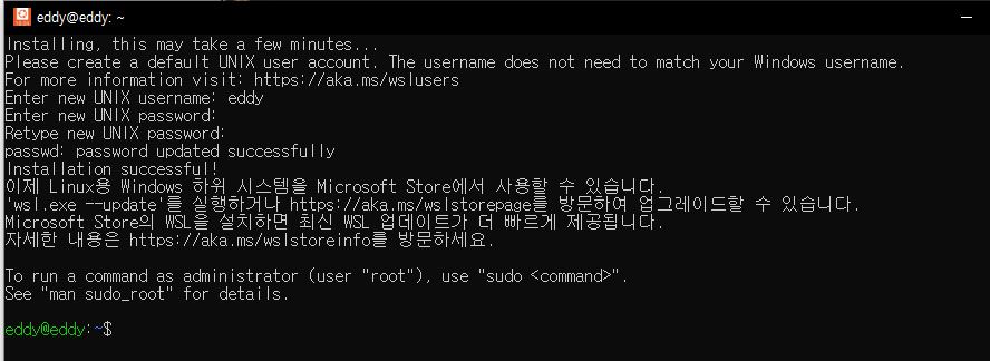나는 계정명을 eddy로 설정하였고 설치가 완료되면 다음과 같은 화면을 확인할 수 있다.