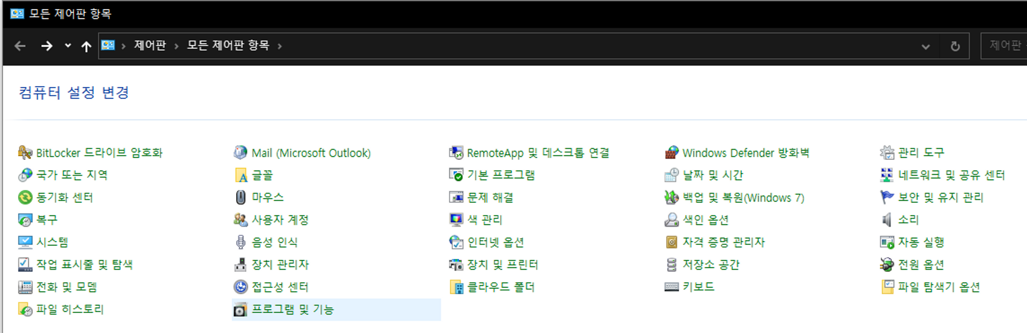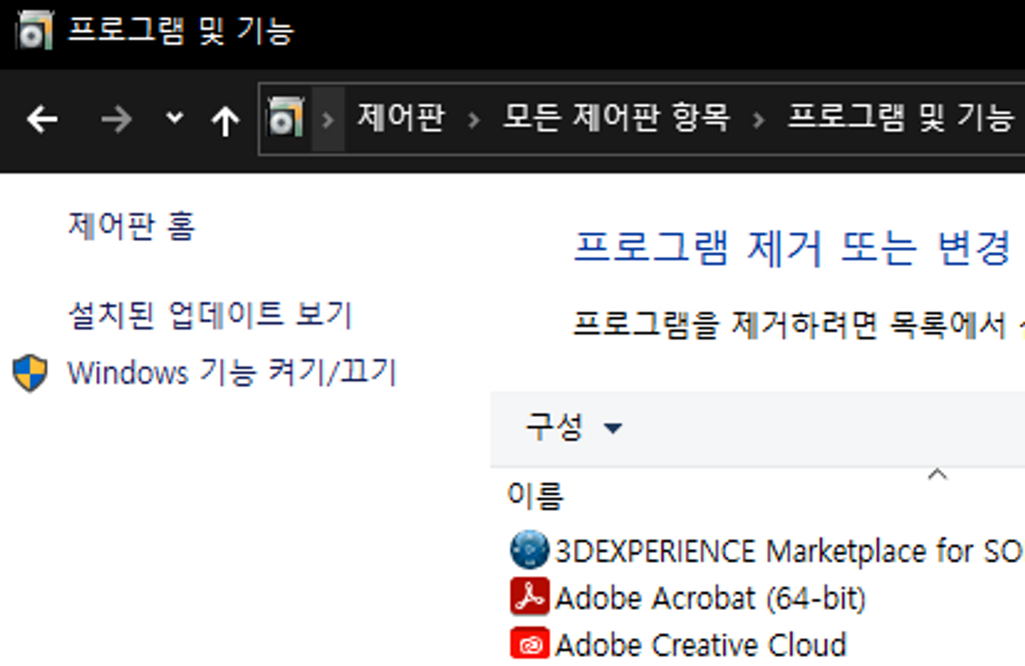 제어판에 들어가면 프로그램 및 성능이 있다. 이를 클릭