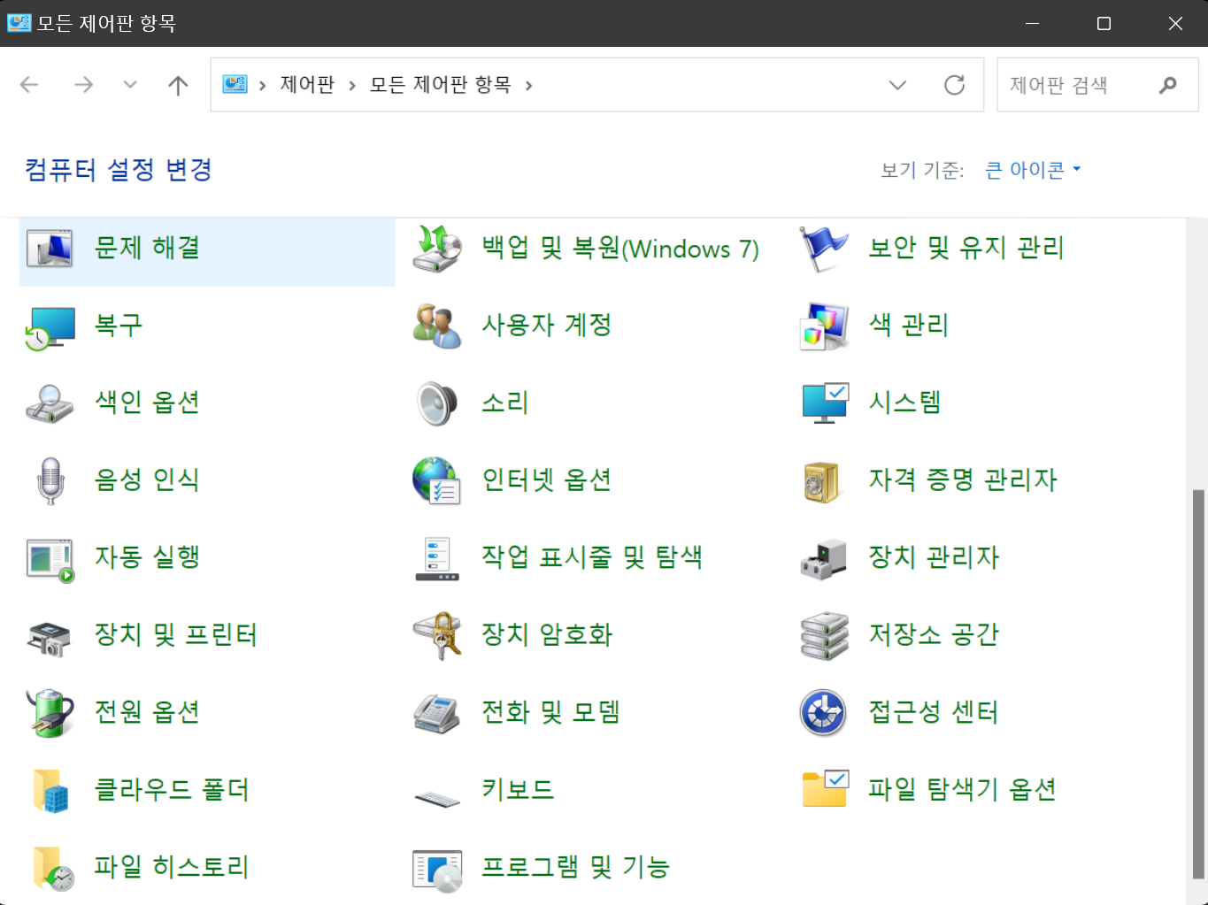 컴퓨터 설정에 따라 제어판 항목은 다르게 보일 수 있음