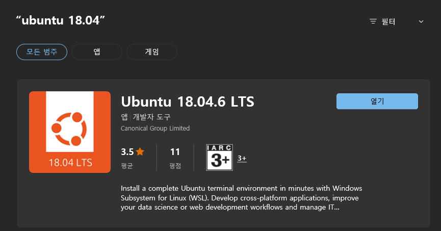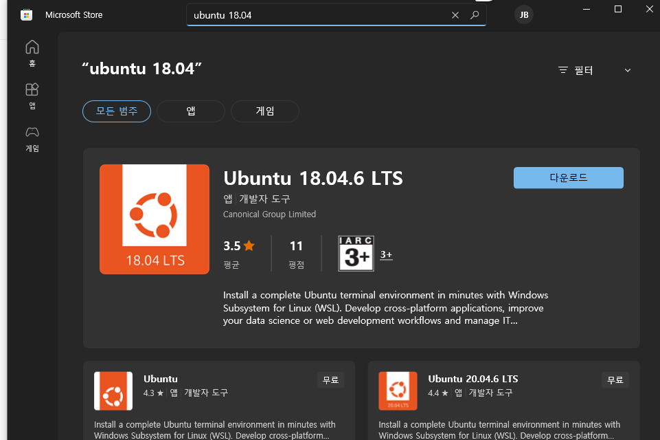 MS Store에 진입한 후 검색창에 ubnutu 18.04를 입력한다.