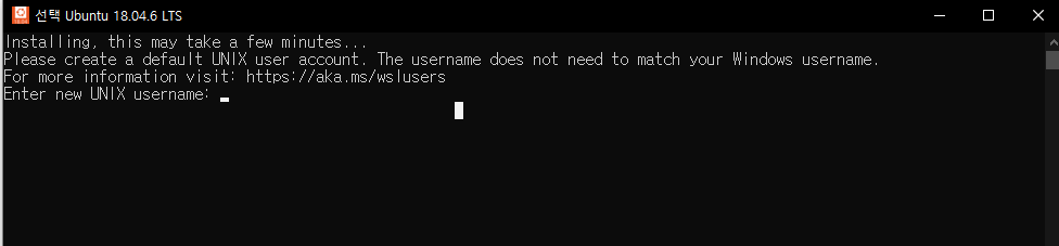 새로운 터미널 창이 실행되면서 우분투 설치가 진행된다.