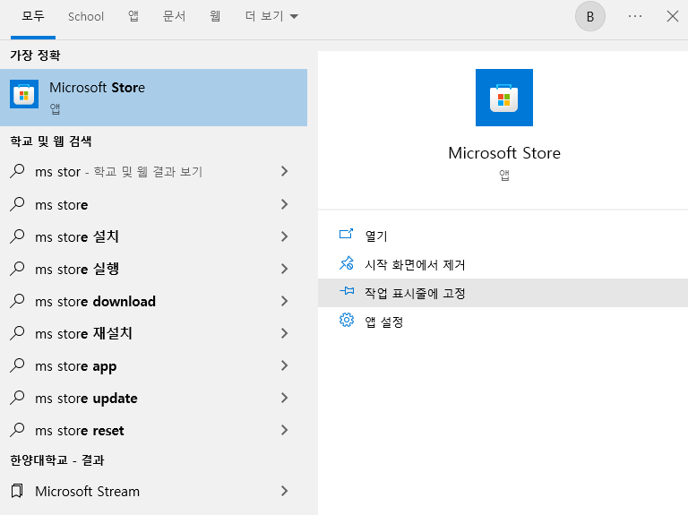 이를 위해 윈도우 검색창에 Microsoft Store 또는 Store를 검색하고 MS Store로 들어간다.