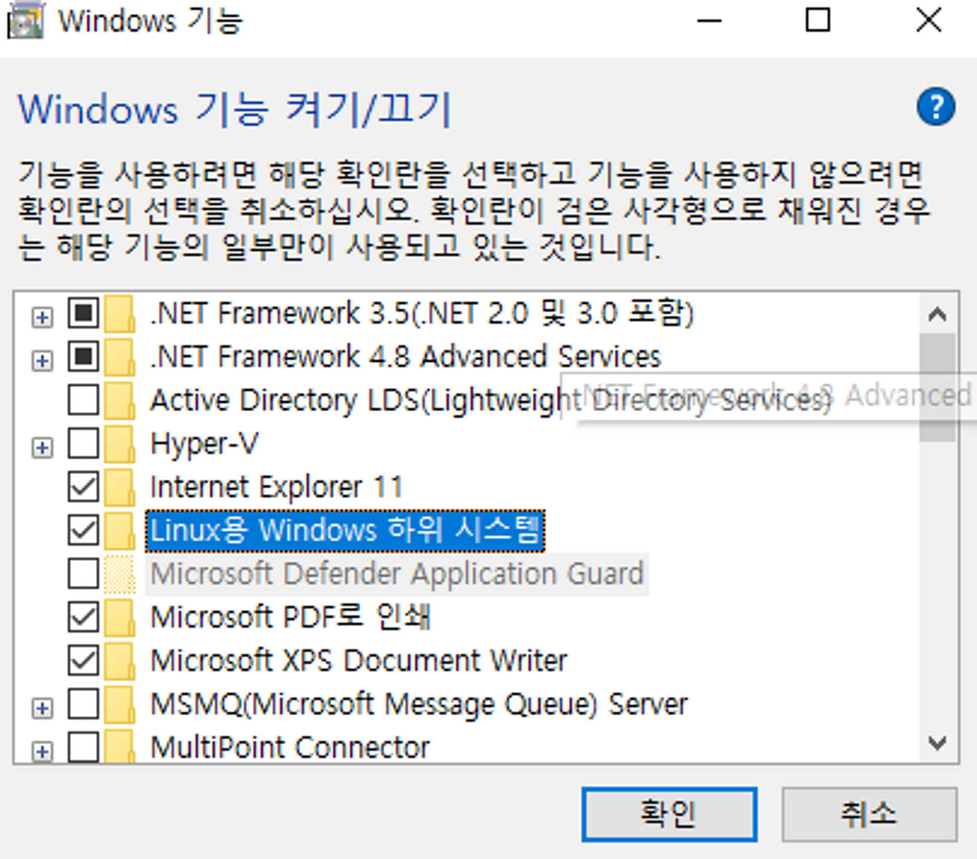 Windows 기능 켜기/끄기 창이 나오면 Linux용 Windows 하위 시스템에 체크한다. 그 다음 확인을 클릭.