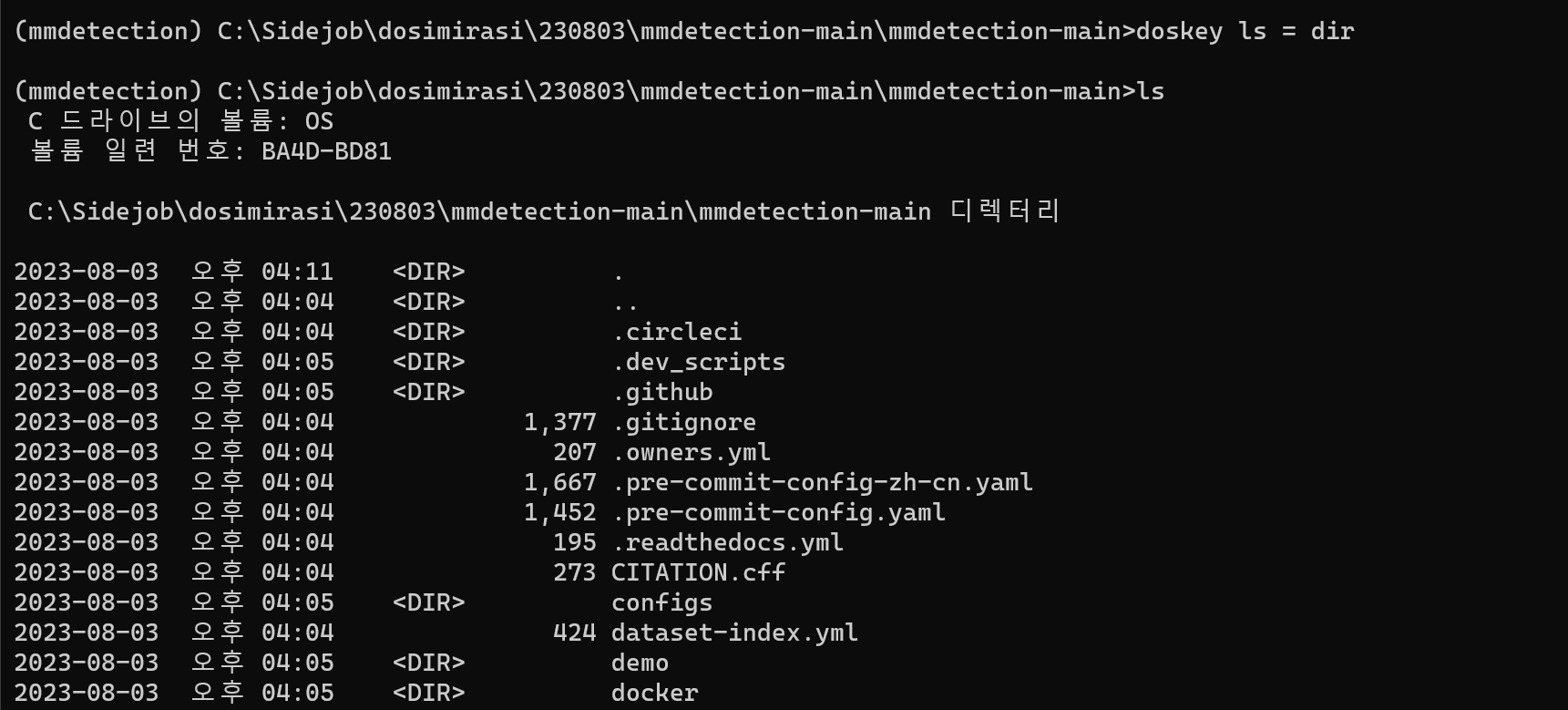 Dev record 'ls'은(는) 내부 또는 외부 명령, 실행할 수 있는 프로그램, 또는배치 파일이 아닙니다. - 반응형 오류 코드 'ls'은(는) 내부 또는 외부 명령, 실행할 수 있는 프로그램, 또는 배치 파일이 아닙니다. 우분투를 썼을때는 ls를 쓰면 바로 파일 리스트가 바로 나왔는데 윈도우 환경에서 miniconda나 cmd에서 ls를 썼을 때는 명령어가 먹지 않는다. dir 이처럼 dir을 입력하면 ls와 같은 역할을 하고 있다. 해결 방법 아래 명령어로 ls를 dir에 매핑시켜준다. doskey ls = dir 그러면 다음과 같이 ls를 입력하면 파일 리스트를 볼 수 있다. 반응형 공유하기 게시글 관리 Barrer. better 저작자표시 비영리 변경금지 (새창열림) 'Dev record' 카테고리의 다른 글 Anaconda 아나콘다 가상환경 삭제 방법 (1) 2023.08.04 cv2.error: OpenCV(4.6.0) D:\a\opencv-python\opencv-python\opencv\modules\imgproc\src\color.cpp:182: error: (-215:Assertion failed) !_src.empty() in function 'cv::cvtColor' (0) 2023.08.04 AttributeError: module 'numpy' has no attribute 'object'. (0) 2023.08.03 pip install 에러: UnicodeDecodeError: 'cp949' codec can't decode byte 0xe2 in position 1049: illegal multibyte sequence (0) 2023.08.03 ImportError: numpy.core.multiarray failed to import (0) 2023.08.03 Contents 당신이 좋아할만한 콘텐츠 Anaconda 아나콘다 가상환경 삭제 방법 2023.08.04 cv2.error: OpenCV(4.6.0) D:\a\opencv-python\opencv-python\opencv\modules\imgproc\src\color.cpp:182: error: (-215:Assertion failed) !_src.empty() in function 'cv::cvtColor' 2023.08.04 AttributeError: module 'numpy' has no attribute 'object'. 2023.08.03 pip install 에러: UnicodeDecodeError: 'cp949' codec can't decode byte 0xe2 in position 1049: illegal multibyte sequence 2023.08.03 댓글 0 + 이전 댓글 더보기