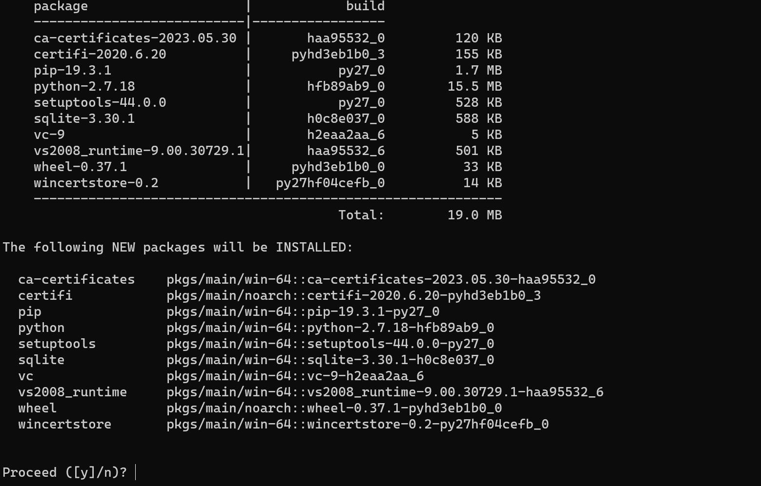 y를 입력하면 해당 환경에 관련된 패키지들을 바로 설치가 되면서 콘다 가상환경이 생성된다.