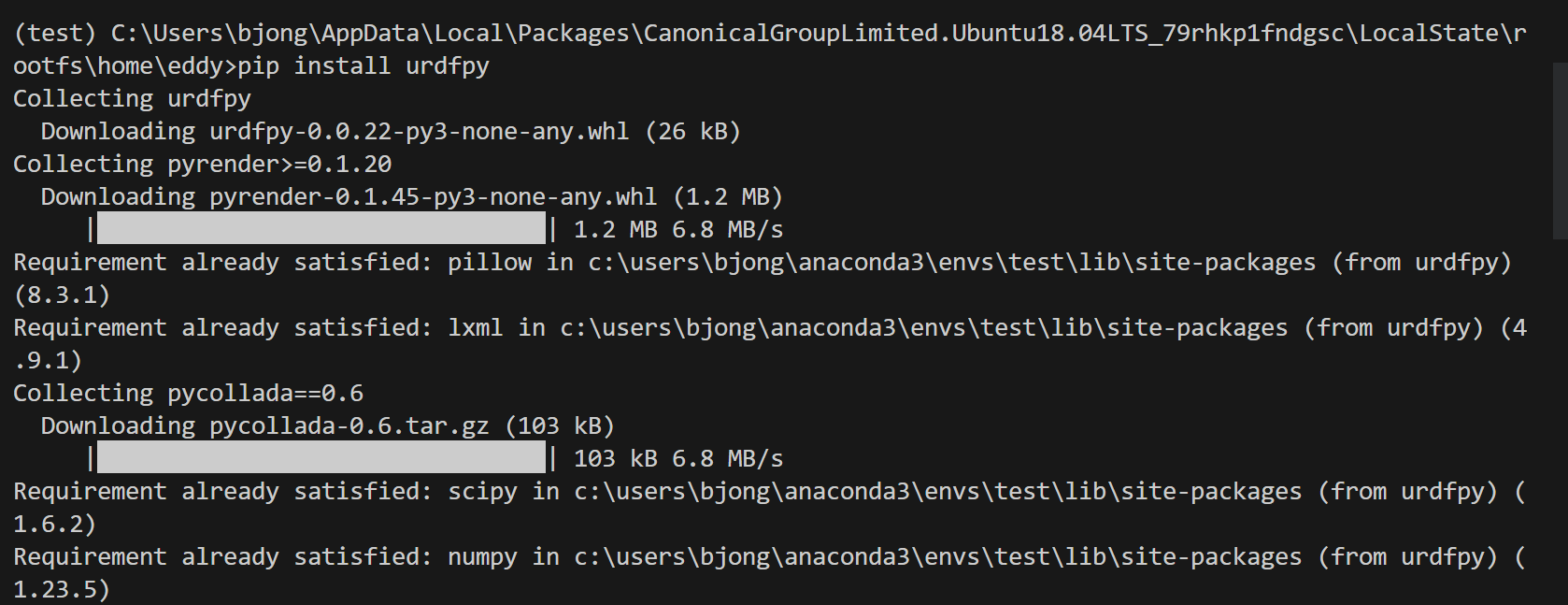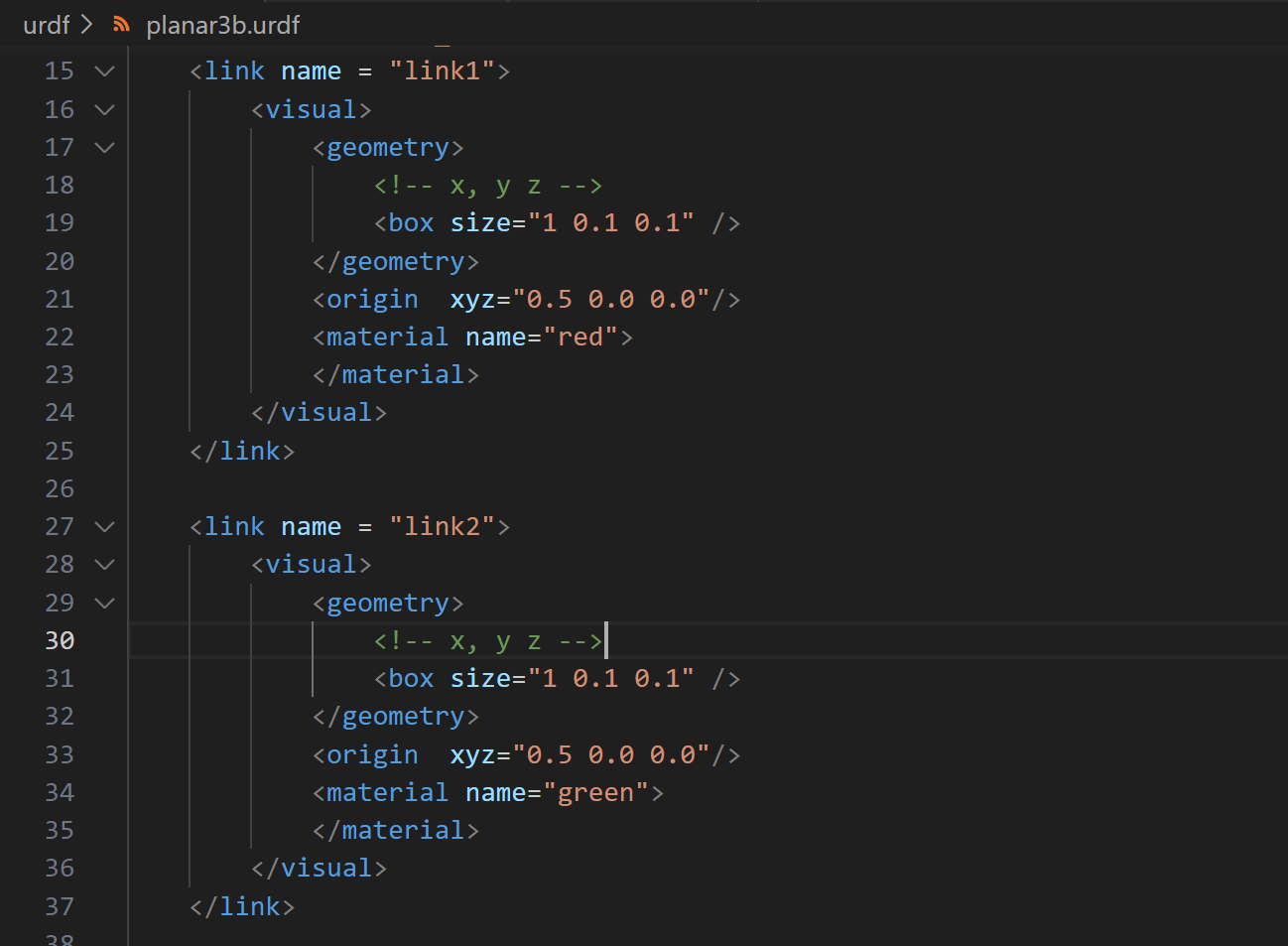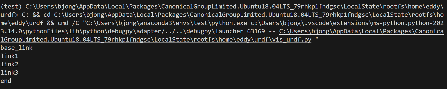 Dev record/ROS [ROS] python에서 urdf 사용하기 urdfpy - 반응형 Python에서urdf를 바로 사용하는 방법 관련 패키지 설치하기 우선 pip을 이용해 urdfy를 설치한다. pip install urdfpy 사용 예시 from urdfpy import URDF robot = URDF.load("./planar3b.urdf") urdfpy를 불러와 기존에 작성해둔 urdf 파일을 불러온다. vscode에서 urdf 작성을 간편하고 빠르게 해주는 extension 설치는 아래 링크를 참고하면 된다. https://barrer.tistory.com/95 [ROS] vscode urdf 자동완성 extension URDF ROS를 사용할 때 urdf를 정말 많이 사용한다, 이 때 VScode를 사용해서 코드를 작성하는 경우 xml 형식의 코드를 짜는데 은근 실수를 많이한다. 그리고 꺽쇠를 쓸 때 정말 귀찮기도하다. 그래서 자동 barrer.tistory.com 해당 urdf 파일의 일부를 보면 다음과 같다 link는 base_link, link1, link2, link3, end로 총 5개가 있다. 이를 urdfpt 패키지를 import 한 다음 각 link들의 이름을 출력하는 예시이다. for link in robot.links: print(link.name) 위와같이 urdf 파일의 link 이름들을 잘 출력하는 것을 확인할 수 있다. 참고링크: https://github.com/mmatl/urdfpy GitHub - mmatl/urdfpy: Python parser for URDFs Python parser for URDFs. Contribute to mmatl/urdfpy development by creating an account on GitHub. github.com 반응형 공유하기 게시글 관리 Barrer. better 저작자표시 비영리 변경금지 (새창열림) 'Dev record > ROS' 카테고리의 다른 글 [ROS] Moveit 활용하여 Puma 로봇 작동시키기 (0) 2023.08.27 [ROS] Moveit 실행시 발생하는 오류 REQUIRED process [moveit_setup_assistant-2] has died! (0) 2023.08.27 [ROS] vscode urdf 자동완성 extension URDF (0) 2023.08.05 QXcbConnection: XCB error: 170 (Unknown), sequence: 170, resource id: 90, major code: 146 (Unknown), minor code: 20Segmentation fault (core dumped) (0) 2023.08.05 [ROS] turtlesim 사용해보기, 로스 거북이 시뮬레이션 터틀심 키보드로 작동시키기 (0) 2023.07.29 Contents 당신이 좋아할만한 콘텐츠 [ROS] Moveit 활용하여 Puma 로봇 작동시키기 2023.08.27 [ROS] Moveit 실행시 발생하는 오류 REQUIRED process [moveit_setup_assistant-2] has died! 2023.08.27 [ROS] vscode urdf 자동완성 extension URDF 2023.08.05 QXcbConnection: XCB error: 170 (Unknown), sequence: 170, resource id: 90, major code: 146 (Unknown), minor code: 20Segmentation fault (core dumped) 2023.08.05 댓글 0 + 이전 댓글 더보기